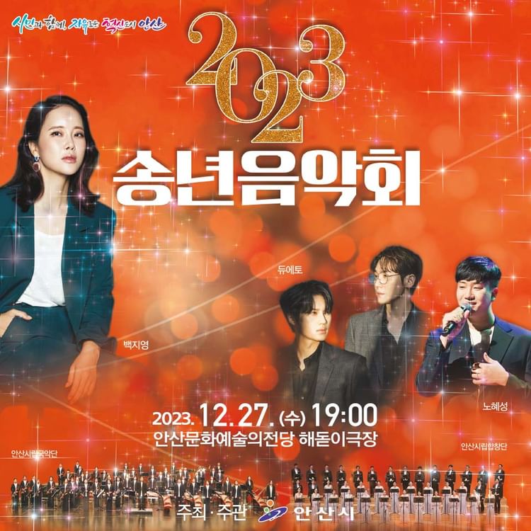 경기도 안산 주민분들께 즐거운 소식이 있습니다. 초대공연(백지영, 듀에토, 노혜성), 안산시립합창단, 안산시립국악단(with 신승태) 가족 연인과 좋은 추억을 쌓을 수 있는 2023 송년음악회에 방문해 보는 것은 어떨까요.