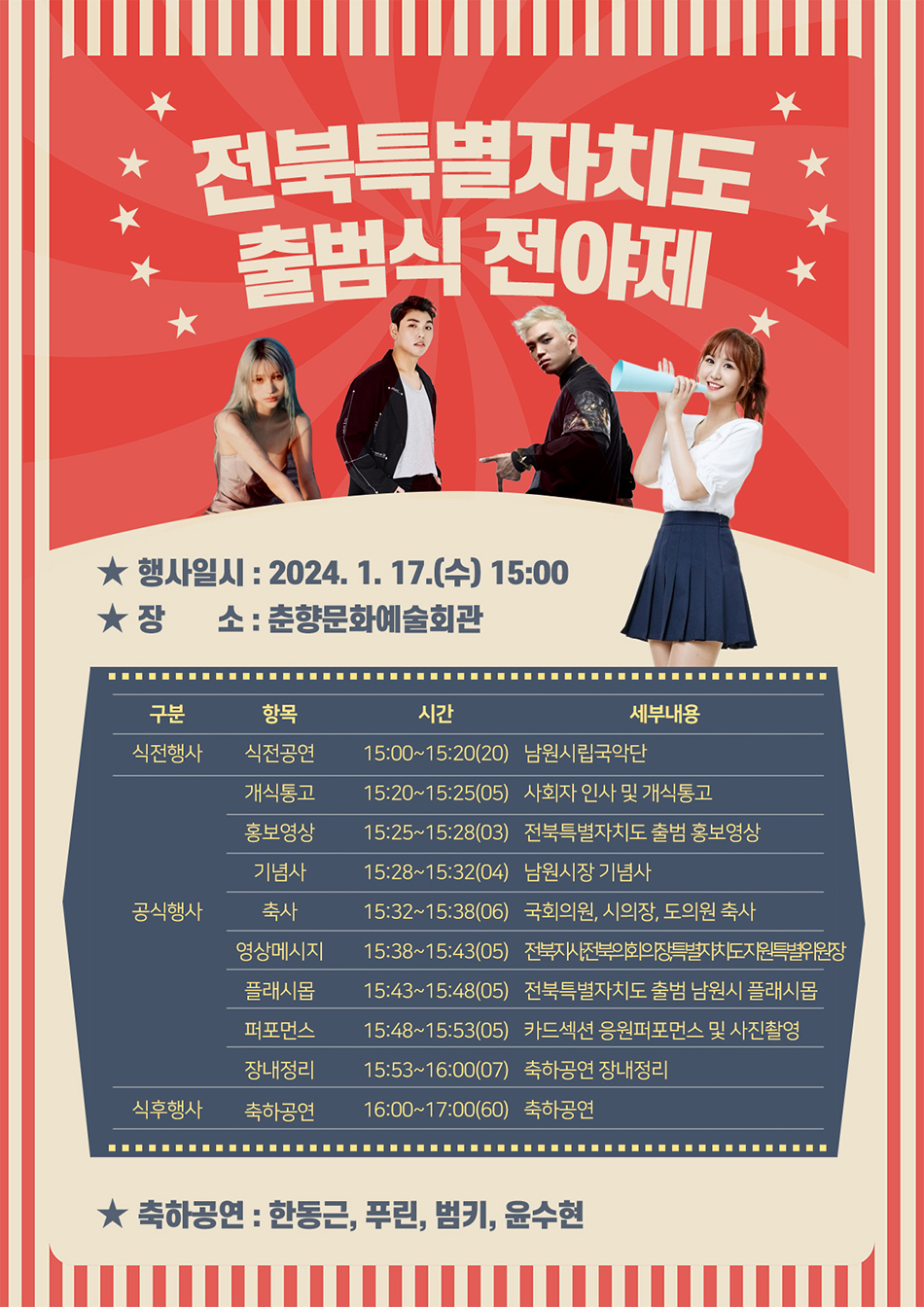 전라북도 남원 주민분들께 즐거운 소식이 있습니다. 축하공연(항동근, 푸린, 범키, 윤수현), 플래시몹, 퍼포먼스 등 가족 연인과 좋은 추억을 쌓을 수 있는 전북특별자치도 출범식 전야제에 방문해 보는 것은 어떨까요.