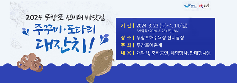 충청남도 보령 주민분들께 즐거운 소식이 있습니다. 초청공연, 개막식, 다양한 체험, 먹거리 등 가족 연인과 좋은 추억을 쌓을 수 있는 2024 무창포 신비의 바닷길 쭈꾸미·도다리 대잔치에 방문해 보는 것은 어떨까요.