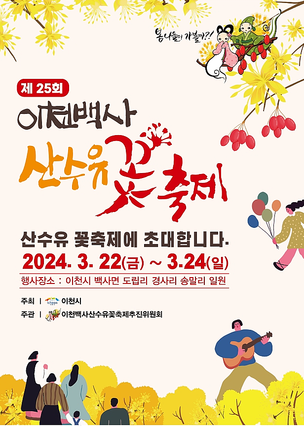 경기도 이천 주민분들께 즐거운 소식이 있습니다. 초청공연, 다양한 체험, 이벤트, 먹거리 등 가족 연인과 좋은 추억을 쌓을 수 있는 제25회 이천백사 산수유꽃축제에 방문해 보는 것은 어떨까요.