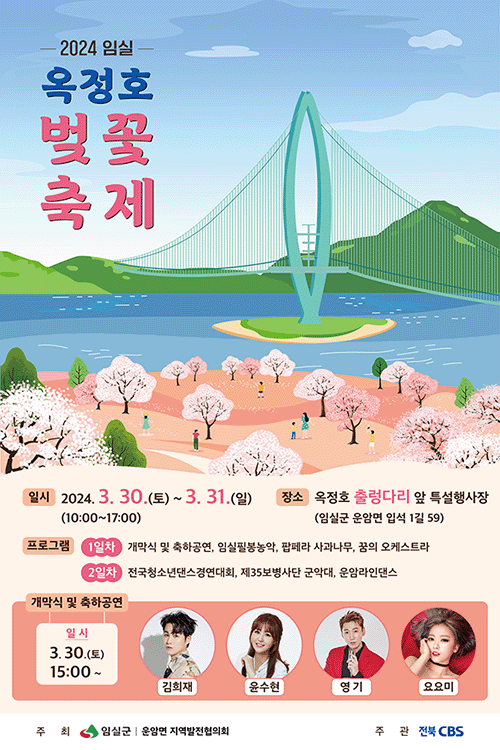전라북도 임실 주민분들께 즐거운 소식이 있습니다. 초청공연(김희재, 윤수현, 영기, 요요미), 임실필봉농악, 팝페라 사과나무, 꿈의 오케스트라, 댄스경연대회, 군악대, 운암라인댄스, 먹거리 등 가족 연인과 좋은 추억을 쌓을 수 있는 2024 임실 옥정호 벚꽃축제에 방문해 보는 것은 어떨까요.