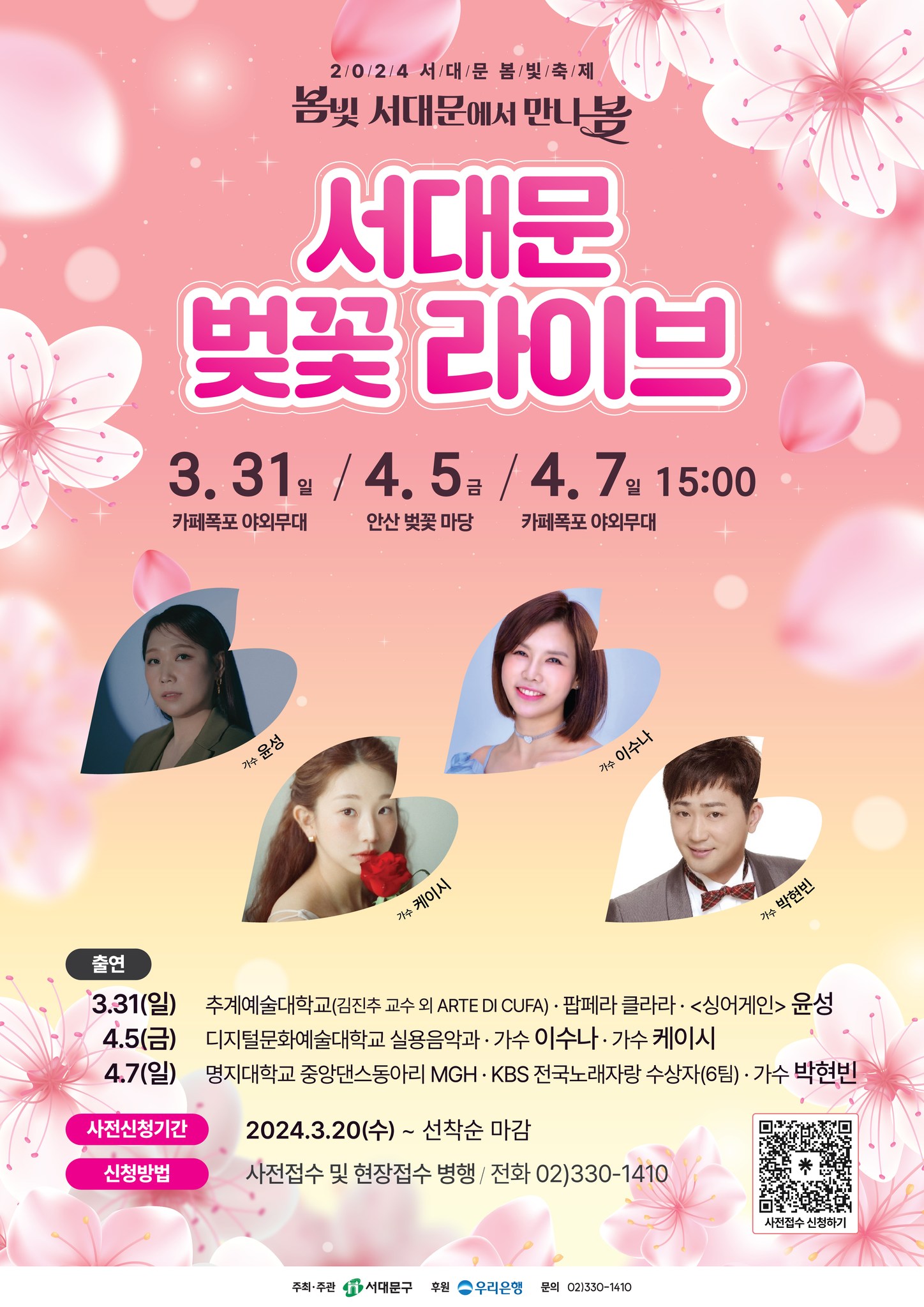 서울 서대문구 주민분들께 즐거운 소식이 있습니다. 초청공연(윤성, 이수나, 케이시, 박현빈), 팝페라 클라라, 추계예술대학교 가족 연인과 좋은 추억을 쌓을 수 있는 서대문벚꽃라이브에 방문해 보는 것은 어떨까요.