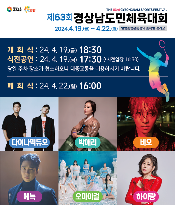 경상남도 밀양군주민분들께 즐거운 소식이 있습니다. 초청공연(오마이걸, 다이나믹듀오, 비오, 에녹, 박애리, 비오, 하이량), 먹거리 가족 연인과 좋은 추억을 쌓을 수 있는 제63회 경상남도민체육대회에 방문해 보는 것은 어떨까요.