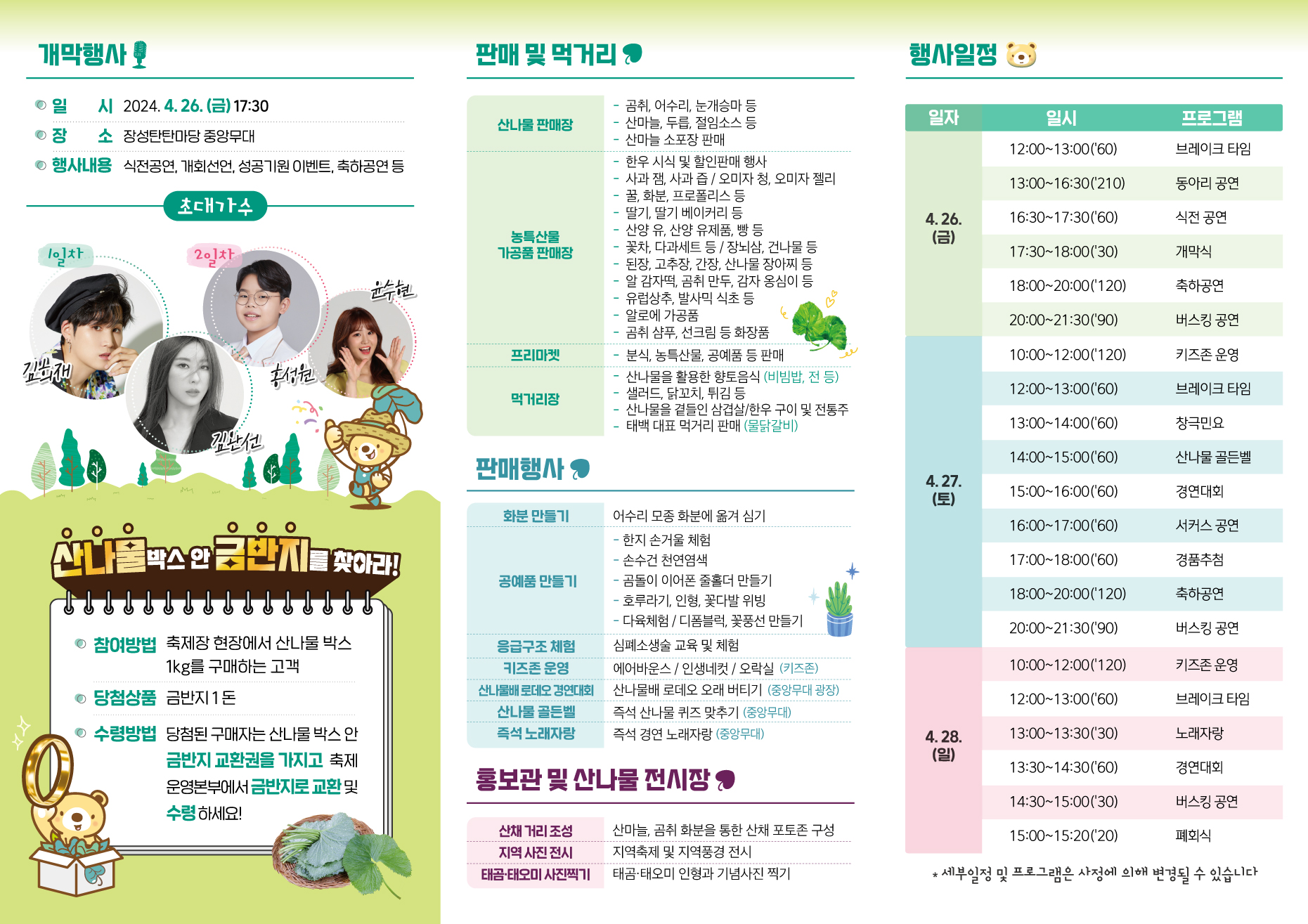 강원도 태백군주민분들께 즐거운 소식이 있습니다. 초청공연(김완선, 김희재, 홍성원, 윤수현), 버스킹, 키즈존, 골든벨, 서커스, 경품추첨, 다양한 체험, 먹거리 등 가족 연인과 좋은 추억을 쌓을 수 있는 2024년 태백 천상의 산나물 축제에 방문해 보는 것은 어떨까요.