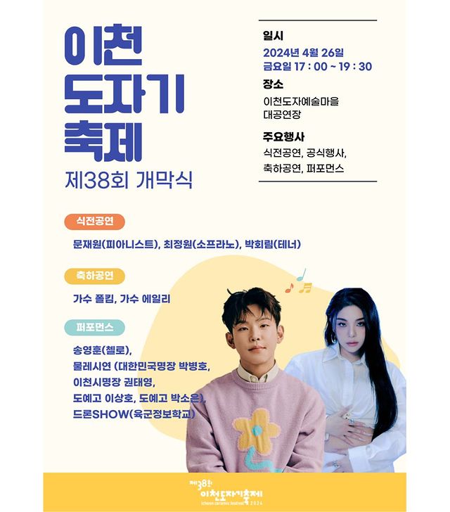 경기도 이천주민분들께 즐거운 소식이 있습니다. 초청공연(폴킴, 에일리), 퍼포먼스, 포토존, 인형극, 먹거리, 다양한 체험 등 가족 연인과 좋은 추억을 쌓을 수 있는 제38회 이천도자기축제에 방문해 보는 것은 어떨까요.