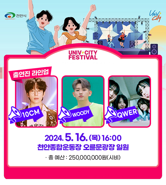 2024 유니브시티 페스티벌이 천안에서 열립니다. 초청공연, EDM, 다양한 체험, 먹거리 등 가족 연인과 즐거운 시간을 보내세요.