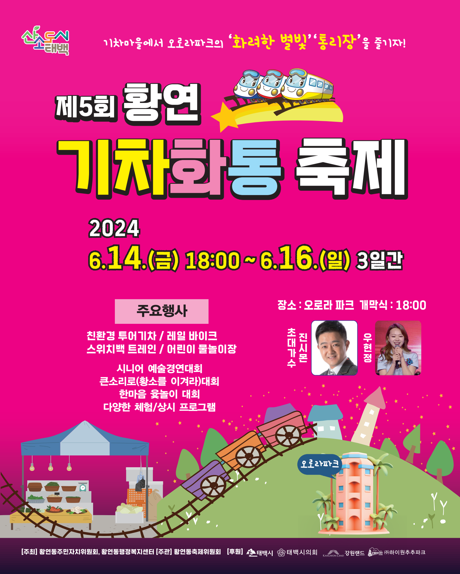 지역 관광자원인 오로라파크에서 별빛을 즐김과 동시에 하이원 추추파크와의 연계로 한 기차화통 축제가 열립니다. 초청공연, 레일 바이크, 스위치백 트레인, 오린이 물놀이장, 다양한 체험, 먹거리 등 가족연인과 즐거운 시간을 보내세요.