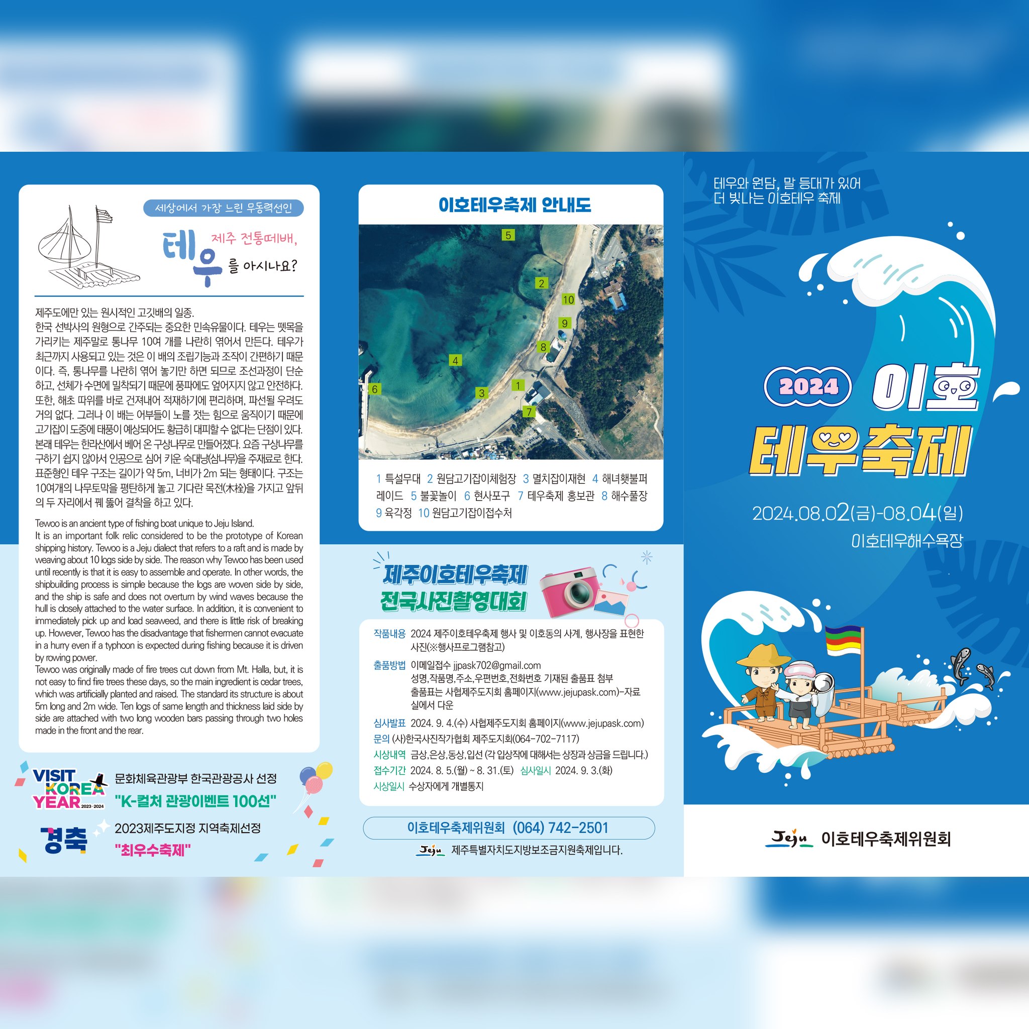 세상에서 가장 느린 무동력선인 제주 전통 떼배, 테우를 주제로 이호테우축제가 열립니다. 다양한 체험, 해녀횃불퍼레이드, 불꽃놀이, 노래자랑, 콘서트 등 가족연인과 즐거운 시간을 보내세요.
