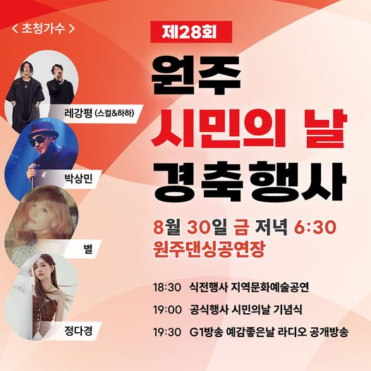새로운 변환! 큰 행복!! 더 큰 원주 제28회 원주시민의 날 경축행사가 열립니다. 원주시립합창단의 공연을 시작으로 초대가수들의 축하공연이 진행되어 여러분에게 즐거움을 선사할 계획이니 놓칠 수 없겠죠~?