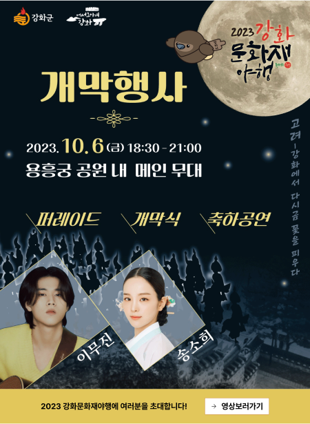 인천 강화 주민분들께 즐거운 소식이 있습니다. 축하공연(이무진, 송소희), 야경, 야로, 야사, 야화, 야설, 야시, 야식 등 가족 연인과 좋은 추억을 쌓을 수 있는 강화문화재야행에 방문해 보는 것은 어떨까요.