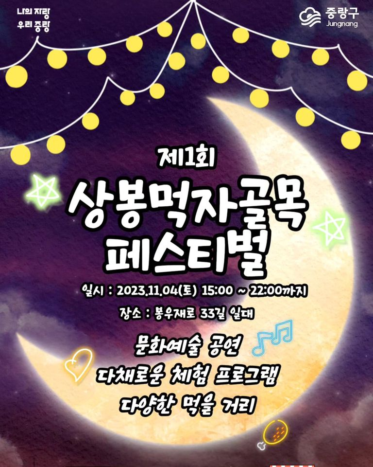 서울 중랑 주민분들께 즐거운 소식이 있습니다. 라퍼커션 공연, 축하공연(8090 추억의 댄스, DJ공연), 다양한 체험 등 가족 연인과 좋은 추억을 쌓을 수 있는 상봉먹자골목 페스티벌에 방문해 보는 것은 어떨까요.