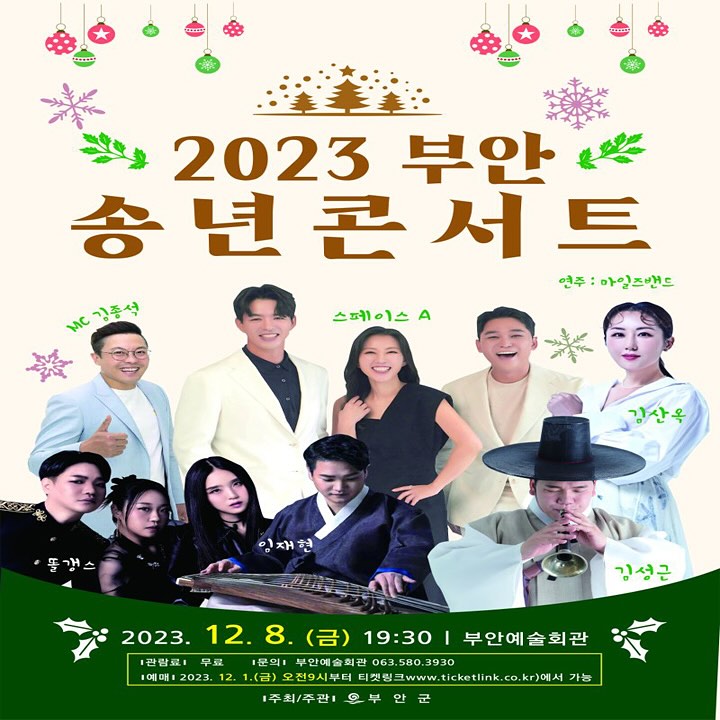 전라북도 부안 주민분들께 즐거운 소식이 있습니다. 초대공연(똘갱스, 김산옥, 스페이스A, 임재현, 마일즈밴드, 김성근), MC김종석 등 가족 연인과 좋은 추억을 쌓을 수 있는 2023 부안 송년콘서트에 방문해 보는 것은 어떨까요.