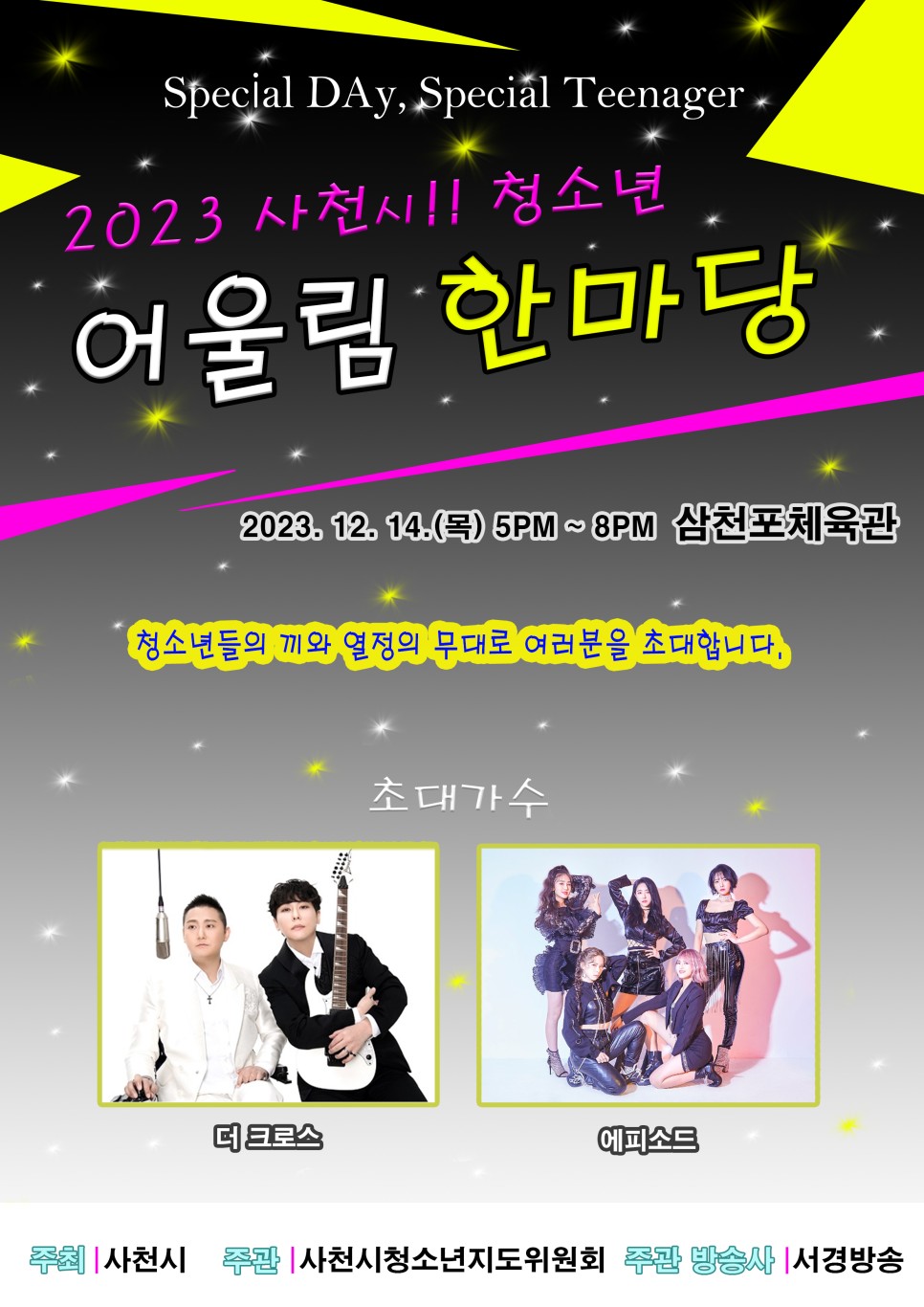 경상남도 사천 주민분들께 즐거운 소식이 있습니다. 초청공연(더크로스, 에피소드) 등 가족 연인과 좋은 추억을 쌓을 수 있는 사천시 청소년 어울림한마당에 방문해 보는 것은 어떨까요.